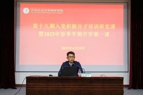 4月29日下午,青岛农业大学海都学院党委书记张照辉在二号楼报告厅为我校第十九期入党积极分子培训班学员讲授党课暨2025年春季学期开学第一课