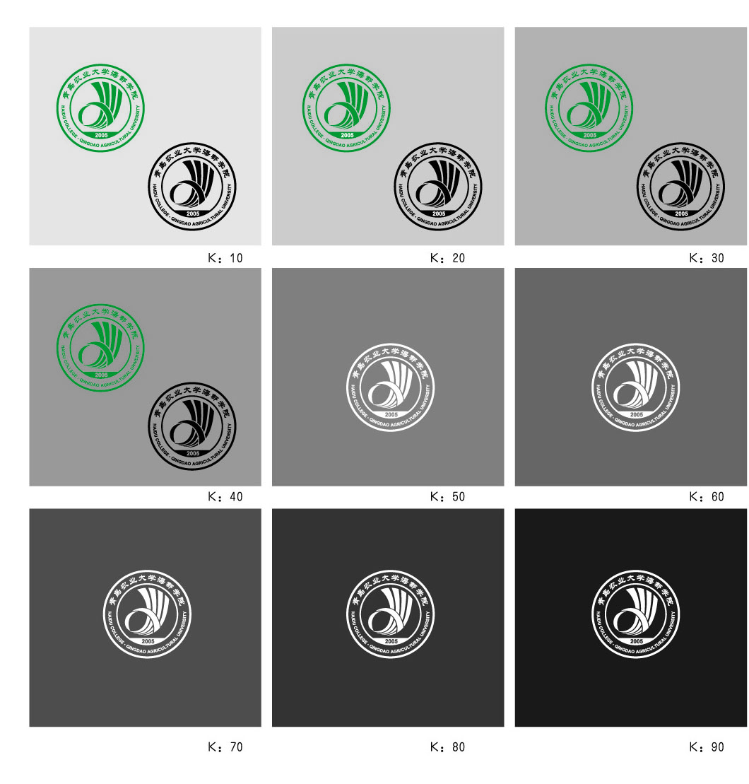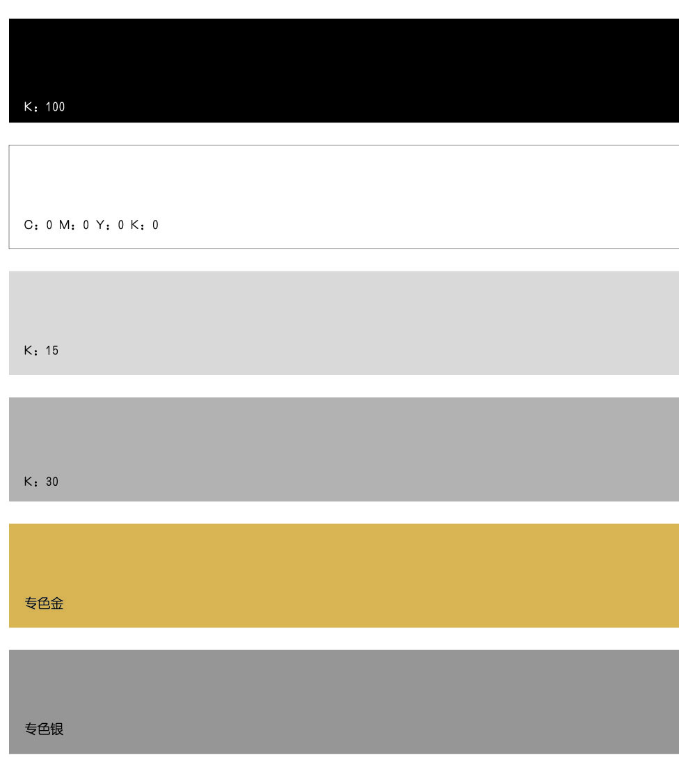 为了使校标形象统一而富有变化,特制定辅助色系列,配合标准色使用,在特殊背景、特殊材料或特殊要求下,基本要素(校标、标准字)可黑、可反白、可凹凸、可灰、可印烫金银。