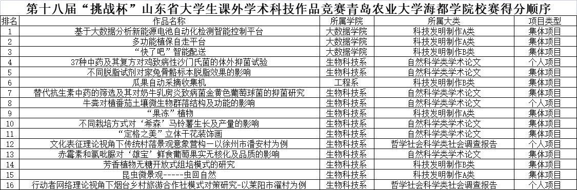 根据专家评审打分,第十八届“挑战杯”山东省大学生课外学术科技作品竞赛青岛农业大学海都学院校赛得分顺序公示,推荐前三名参加省赛: