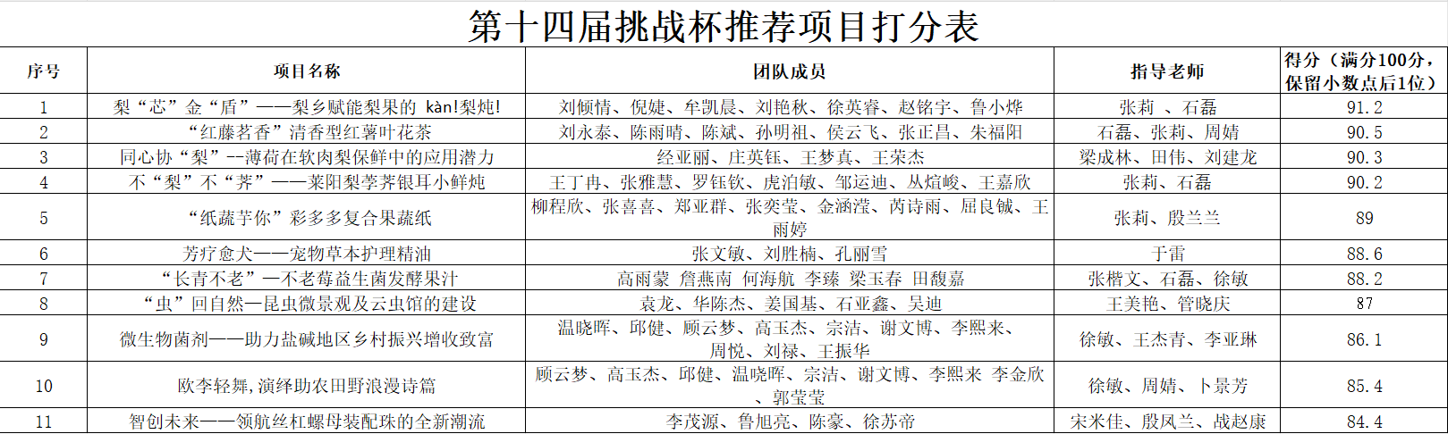 现公示《第十四届挑战杯推荐项目得分排序》,公示时间2024年3月29日至2024年4月4日,如有异议,请于公示期内到1号办公楼403室反馈,或拨打电话0535-2605311进行反馈,逾期不再受理。