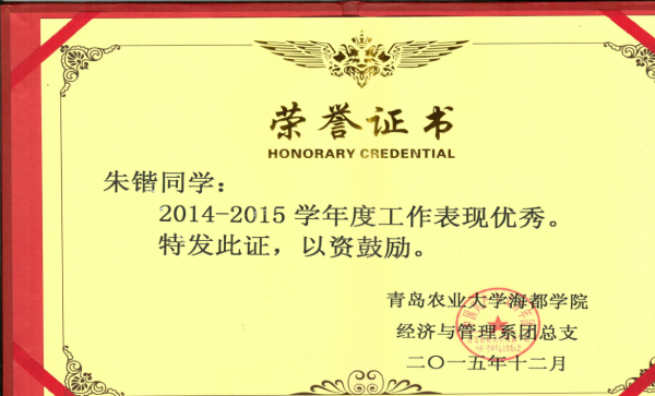 2014年,朱锴怀揣着对未来的无限憧憬,踏入了青岛农业大学海都学院的校门。从大一开始,他就立下升本目标,课堂上认真听讲、积极思考,课下也主动提问,广泛学习。为了锻炼自己,他还通过竞选担任了班级的班长。工作中,他发扬民主、无私奉献,尽心尽力组织班级各项活动,协调同学关系,受到同学们认可。第一学年结束,朱锴凭借优异的学业成绩和出色的领导才能,获得了学业奖学金,并荣获“优秀学生干部”和“三好学生”“优秀彩旗队队员”等多项荣誉称号。这些荣誉不仅是对他辛勤付出的肯定,更是对他综合素质的认可。大二时,他加入学生会宿管部,积极参与学生会的各项工作,因表现出色,成为了宿管部的优秀干事。