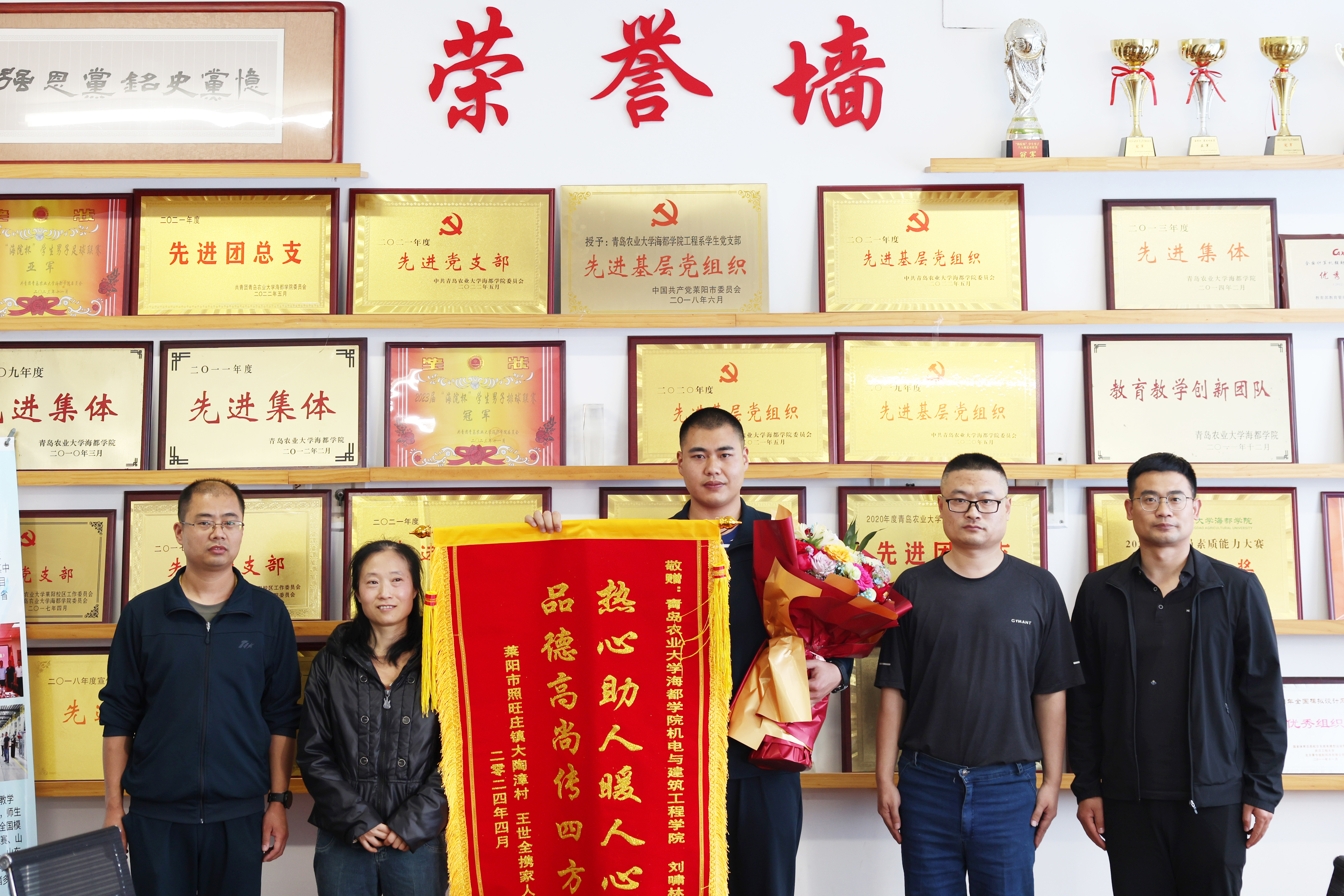 4月22日,走失老人的家属带着锦旗和鲜花来到学校,机电与建筑工程学院党总支副书记赵洪校,学生第二党支部书记、正科级辅导员孙鹏在5号楼327会议室热情接待了家属一行。