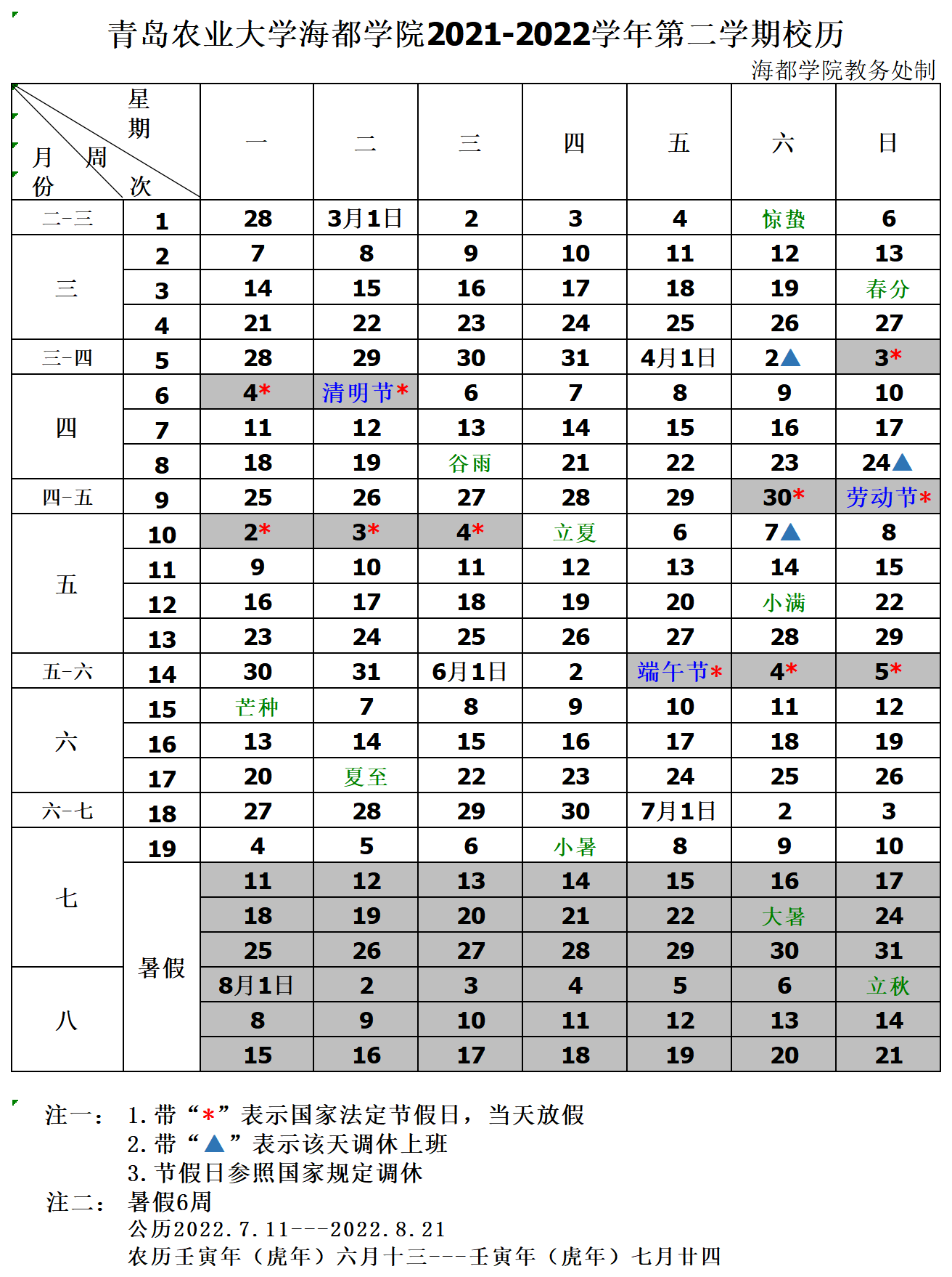 2021-2022学年第二学期校历