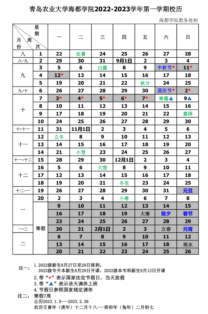 2022-2023学年第一学期校历
